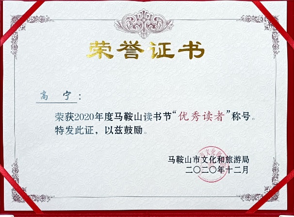 在2021年4月22日上午9:30马鞍山市图书馆开展的“传红色经典 颂建党百年”的2021年马鞍山读书节启动仪式上,beat365图书馆王晓晖老师荣获由中共马鞍山市委宣传部和马鞍山市文化和旅游局联合颁发的2020年度马鞍山市十佳“优秀阅读推广人”称号的荣誉证书,beat36519级学前四班高宁同学荣获由马鞍山市文化和旅游局颁发的2020年度马鞍山读书节十佳“优秀读者”称号的荣誉证书。