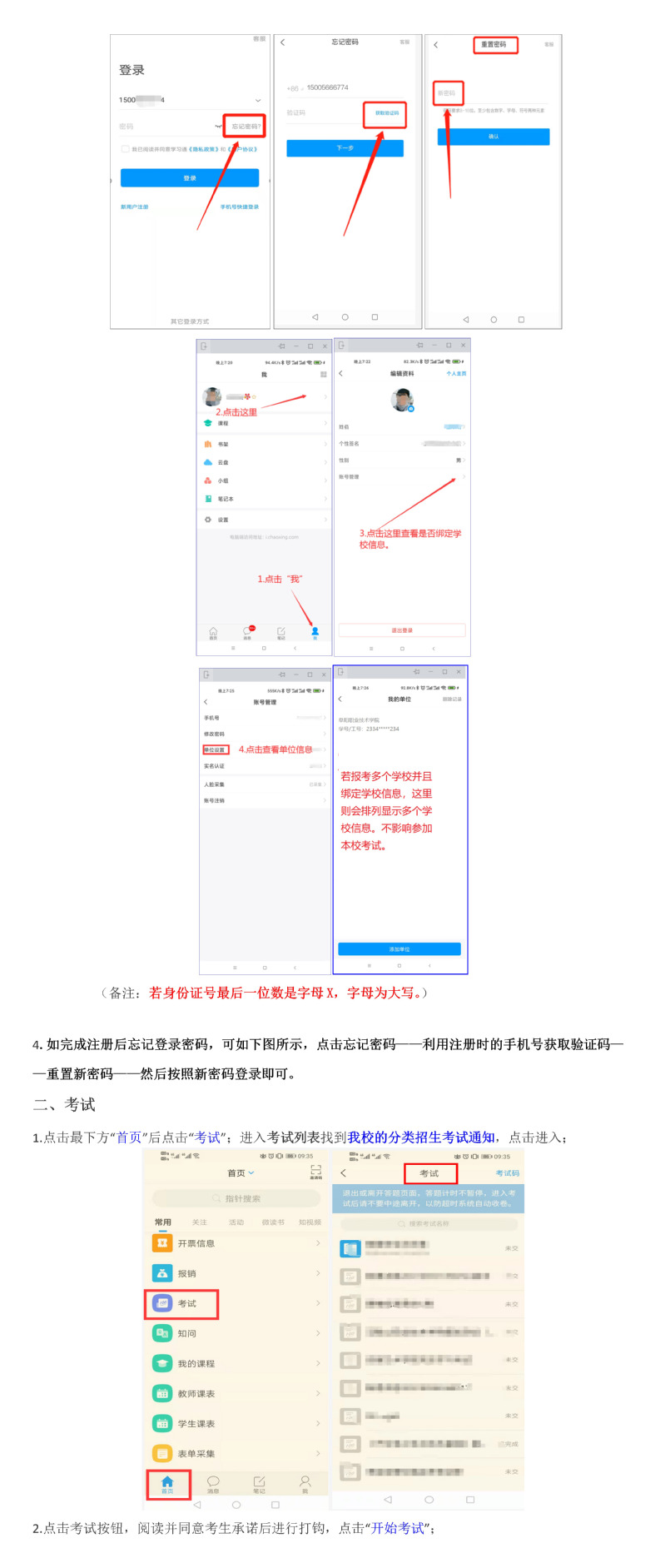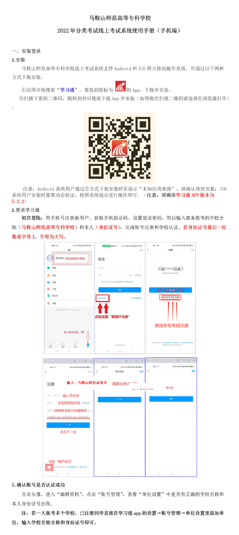 1.2022年4月20日上午8:30—4月21日下午4:00,考生按《beat365正版唯一官方网站2022年分类招生考试线上考试系统使用手册(手机端)》(详见下文)规定,下载并安装网络在线测试系统(学习通),按时登录网络在线测试系统进行模拟演练。初次登陆方法:用手机号注册新用户、获取手机验证码、设置登录密码,然后输入准备报考的学校全称(beat365正版唯一官方网站)和本人(身份证号),完成账号注册和学校认证。若身份证号最后一位数是字母X,字母应为大写。