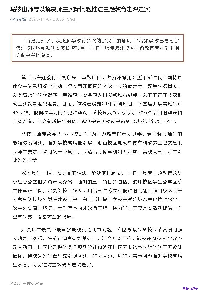 【小马先锋】马鞍山师专以解决师生实际问题推进主题教育走深走实