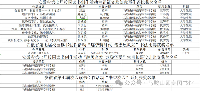 由中共安徽省委教育工委,省教育厅,省人力资源和社会保障厅等单位共同主办的安徽省第七届校园读书创作活动在近期圆满结束,马鞍山师专师生在此次活动中表现出色,取得佳绩。