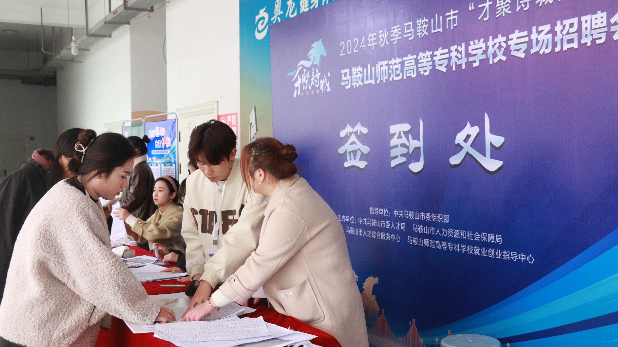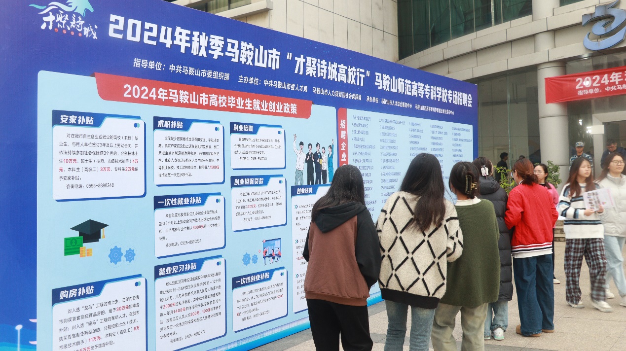 会场门口还设立了“2024年马鞍山市高校毕业生就业创业政策”展板,为前来求职的学生提供来自学校和政府的双重支持。